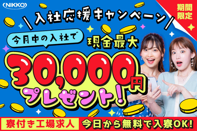 >>総額3万円プレゼント中<< この工場に応募後、 入社後1週間目に残りの2万円GET♪