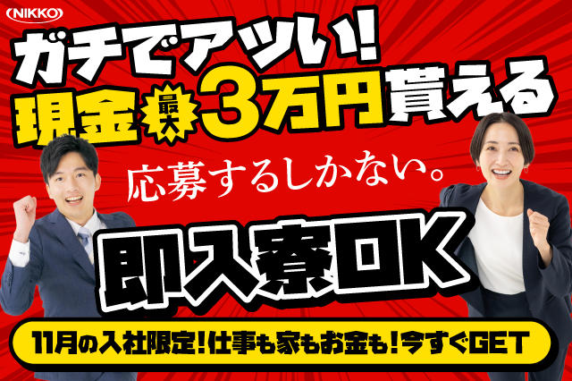 【1】寮費ずっと0円(間取りは2DKもしくは3DK) 【2】寮は家具・家電&フリーWi-Fi完備! 【3】年2回の賞与あり!(6月・12月) 【4】毎月1万円の食事手当支給! 【5】毎月2万円の皆勤手当支給! └───────────────┘ ━━━━━━━━━━━━━━ 【日払いの場合】 \入社2週目より日払い利用可/ 例)8/18(月)出勤⇒8/25(月)日払い振込