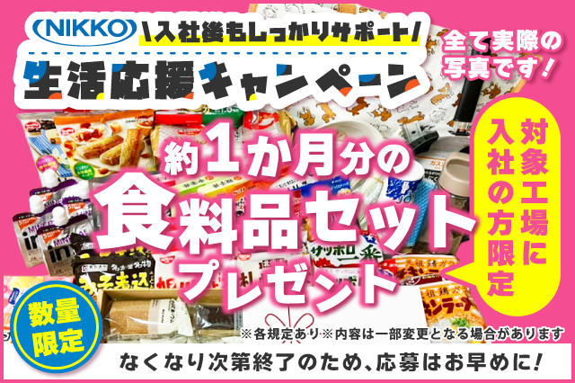 | 福利厚生 | ━━━━━━━━ 〇社会保険各種 〇有給休暇 〇健康診断の無料受診(入社時、定期) 〇通勤交通費支給 〇工場内駐車場 〇ロッカー 〇作業着貸与 〇家具・家電付き寮完備 ※各規程有 |