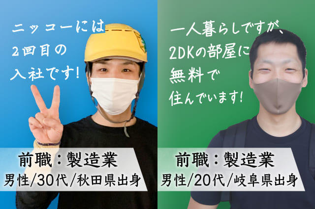 | 特典内容 | \今だけ!食料品中心の生活支援パックプレゼント/ ~パックの中身~ 【パックご飯(20食分)】 【カレーなどのレトルト食品(5食分)】 【インスタント麺(10食分)】 【栄養補助食品(2本入り6袋×2セット)】 【その他の生活用品もプレゼント】 ※内容については多少変更となる可能性がございます ┌─────[ 限定特典 ]─────┐ 【1】寮費ずっと0円 【2】寮は家具・家電&フリーWi-Fi完備! 【3】年2回の賞与あり! 【4】毎月1万円の食事手当支給! 【5】毎月2万円の皆勤手当支給! └─────────────────┘