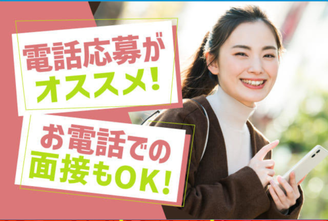 | 選べる面接方法 | 【自宅からでもOK!選べる面接方法】 (1)電話面接 (2)自宅からできるスマホ(WEB)面接 (3)来社していただく面接 ★お好きな面接方法を選べます! 応募時にご希望を伝えていただくとスムーズです |