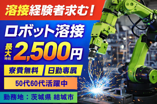 【溶接経験者集まれ!】ロボット溶接・最大時給2,500円/寮費無料◆日勤専属・土日祝休み◆50代・60代活躍中