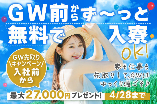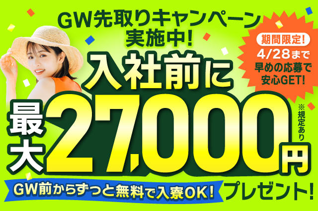 【4/28日まで即日入寮可(事前予約でGW中も入寮OK)】入社前から最大27,000円支給!|所持金0・携帯・家なしOKの寮付き工場ワーク