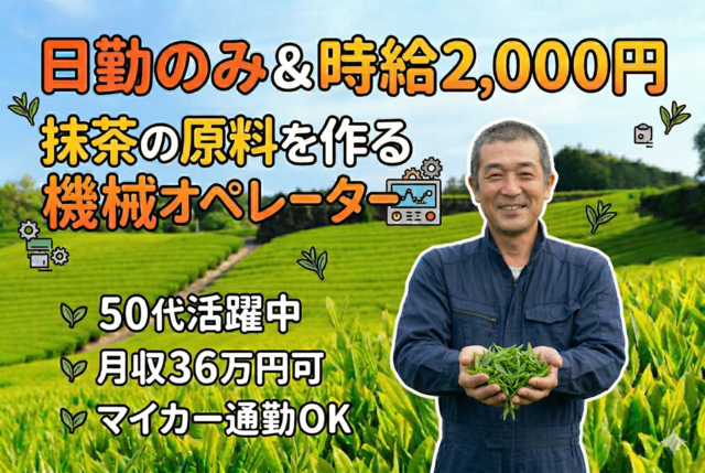 【日勤のみ&時給2,000円の好待遇求人!!】50代のスタッフ活躍中☆月収36円可☆抹茶の原料を作る機械オペレーター☆