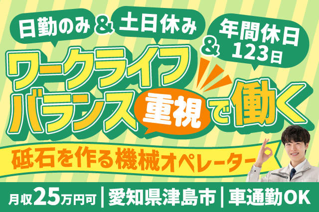 【日勤のみ&土日休み&年間休日123日】ワークライフバランス重視で働く♪月収25万円可☆工場内で砥石を作る機械オペレーター☆
