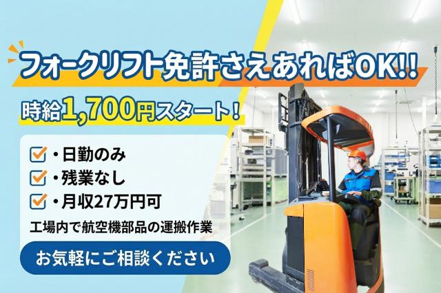 【リフト免許があればOK!!時給1700円スタート!】フォークリフトで航空機部品の運搬作業★日勤のみ×残業ナシ!なのに月収27万円可★