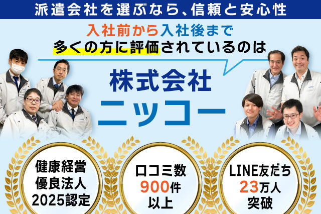 【ニッコーはクチコミ900件以上・Google評価★4.5・健康経営優良法人2025認定】派遣会社を選ぶなら信頼性で!寮費無料×月収40万円以上可の住み込み求人多数!