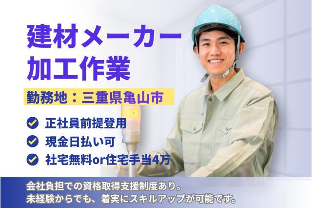 【半年後には正社員!!】働きながらキャリアアップしたい方へ★住宅手当を毎月40,000円支給★家の外壁となる材料の加工作業★