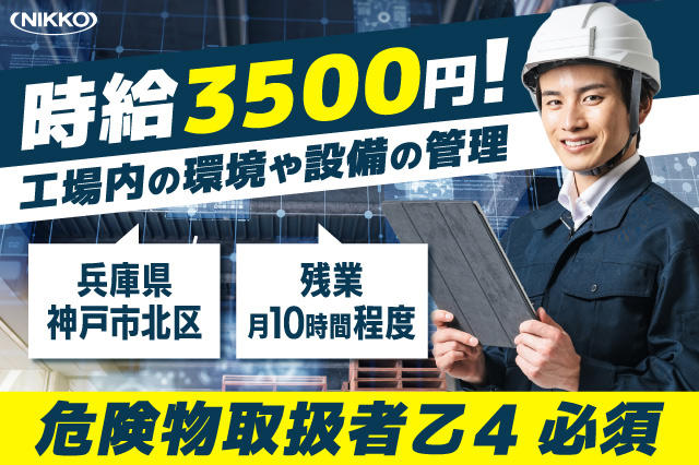 【工場内の環境や設備の管理】危険物取扱者(乙4)必須!時給3500円!残業月10時間程度!