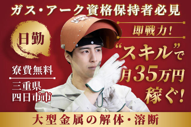 【ガス・アーク溶接資格を持ってる方必見!!】大型金属の溶断作業★月収35万可★ミドル世代活躍中★寮費がずっと無料★